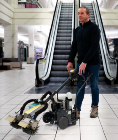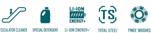 Die ERC45 ist eine der fortschrittlichsten akkubetriebenen Maschinen zur Reinigung und Saugtrocknung von Rolltreppenstufen weltweit. Das Modell überzeugt durch sein geringes Gewicht, hohe Mobilität sowie eine schnelle und ergonomische Handhabung. Damit erfüllt die ERC45 optimal die heutigen Anforderungen an eine effiziente Schmutzbeseitigung und sorgt für eine gründliche Reinigung aller frei zugänglichen Rolltreppenoberflächen. Zu den besonderen Stärken der ERC45 zählen ihr geräuscharmer Betrieb, die platzsparende Transportfähigkeit dank eines durchdachten Klappmechanismus sowie die wartungsfreundliche Konstruktion, die mit minimalem Werkzeugeinsatz auskommt. Zudem gewährleistet sie eine herausragende Reinigungsleistung bei hoher Arbeitsgeschwindigkeit. Für eine umfassende Reinigung von Rolltreppen kann die ERC45 nicht nur in Kombination mit der EC52, sondern auch mit anderen spezialisierten Reinigungsmaschinen für Rolltreppenstufen eingesetzt werden. Der neu entwickelte GlideStep System® Mechanismus sorgt dafür, dass sich die Maschine zügig und ohne großen Kraftaufwand von einer Stufe zur nächsten bewegt. Dank dieser durchdachten Technologie entfällt das zeitintensive manuelle Umsetzen der Maschine. Dadurch kann der Bediener die komplette Rolltreppe effizient und ohne große körperliche Belastung reinigen. Besonders effizient ist der Einsatz zusammen mit der EC52: Während diese eigenständig die Stufen einer Rolltreppe reinigt, kann ein Bediener parallel die Setzstufen einer zweiten Rolltreppe bearbeiten. Anschließend werden die Maschinen einfach getauscht. Dieses Verfahren spart deutlich Zeit und reduziert die Betriebskosten erheblich.